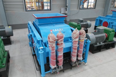 選礦用破碎機兩輥輪之間裝有楔形或墊片調節裝置,楔形裝置的頂端裝有調整螺栓,當調整螺栓將楔塊向上拉起時,楔塊將活動輥輪頂離固定輪,即兩輥輪間隙變大,出料粒度變大,當楔塊向下時,活動輥輪在壓緊彈簧的作用下兩輪間隙變小,出料粒度變小。墊片裝置是通過增減墊片的數量或厚薄來調節出料粒度大小的,當增加墊片時兩輥輪間隙變大,當減少墊片時兩輥輪間隙變小,出料粒度變小。